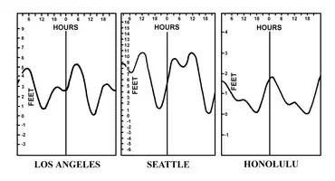 In the mixed tide, the diurnal and semidiurnal oscillations are both important factors and the tide is characterized by a large inequality in the high water heights, low water heights, or in both. There are usually two high and two low waters each day, but occasionally the tide may become diurnal. Such tides are prevalent along the Pacific coast of the United States and in many other parts of the world. Examples of mixed types of tide are shown in Figure 905c. At Los Angeles, it is typical that the inequalities in the high and low waters are about the same. At Seattle the greater inequalities are typically in the low waters, while at Honolulu it is the high waters that have the greater inequalities.
