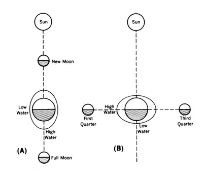 Figure 908b. (A) Spring tides occur at times of new and full Moon. Range of tide is greater than average since solar and lunar tractive forces act in same direction. (B) Neap tides occur at times of first and third quarters. Range of tide is less than average since solar and lunar tractive forces act at right angles.