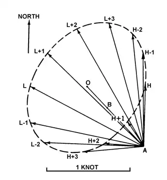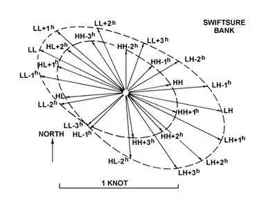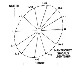 Figure 914a. Rotary tidal current. Times are hours before and after high and low tide at Nantucket Shoals. The bearing and length of each arrow represents the hourly direction and speed of the current.