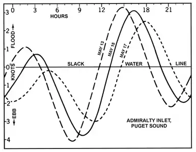 For each day, the date and day of week are given; current information follows. If the cycle is repeated twice each tidal day, currents are semidiurnal. On most days there are four slack waters and four maximum currents, two floods (F) and two ebbs (E). However, since the tidal day is longer than the civil day, the corresponding condition occurs later each day, and on certain days there are only three slack waters or three maximum currents. At some places, the current on some days runs maximum flood twice, but ebbs only once, a minimum flood occurring in place of the second ebb. The tables show this information.