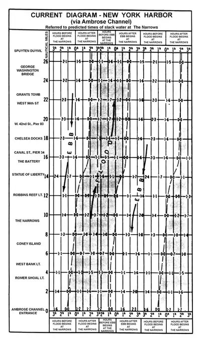 On Figure 938, each vertical line represents a given instant identified by the number of hours before or after slack water at The Narrows. Each horizontal line represents a distance from Ambrose Channel entrance, measured along the usually traveled route. The names along the left margin are placed at the correct distances from Ambrose Channel entrance. The current is for the center of the channel opposite these points. The intersection of any vertical line with any horizontal line represents a given moment in the current cycle at a given place in the channel. If this intersection is in a shaded area, the current is flooding; if in an unshaded area, it is ebbing. The velocity can be found by interpolation between the numbers given in the diagram. The given values are averages. To find the value at any time, multiply the velocity found from the diagram by the ratio of maximum velocity of the current involved to the maximum shown on the diagram. If the diurnal inequality is large, the accuracy can be improved by altering the width of the shaded area to fit conditions. The diagram covers 1 1/2 current cycles, so that the right 1/3 duplicates the left 1/3.