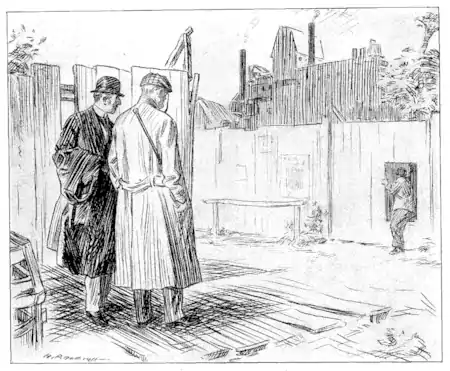 We walked slowly past the tall, blank-faced building, and were just turning to repass it when a steam whistle sounded, a wicket opened in the main gate, and a stream of workmen—each powdered with white, like a miller—emerged into the street. We halted to watch the men as they came out, one by one, through the wicket, turning to the right or the left toward their homes or some near-by coffee-shop; but none of them answered the description that my friend had given.