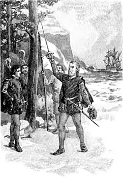 22. John Cabot takes possession of the country for the king of England.— Cabot went on shore, with his son and some of his crew. In the vast, silent wilderness they set up a large cross. Near to it they planted two flagpoles, and hoisted the English flag on one, and the flag of Venice (Ven′is), the city where John Cabot had lived in Italy, on the other. Then they took possession of the land for Henry the Seventh. It was in this way that the English came to consider that the eastern coast of North America was their property, although they did not begin to make settlements here until nearly a hundred years later.