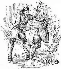 42. Smith's life is saved by Pocahontas5; her marriage to John Rolfe6.—Smith was dragged into the chief's wigwam; his head was laid on a large, flat stone, and a tall savage with a big club stood ready to dash out his brains. Just as Powhatan was about to cry "strike!" his daughter Pocahontas, a girl of twelve or thirteen, ran up, and, putting her arms round the prisoner's head, she laid her own head on his—now let the Indian with his uplifted club strike if he dare.7