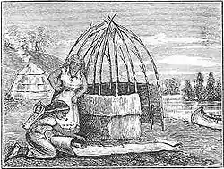 The Indians at the east did not build cities, but lived in small villages. These villages were made up of huts, covered with the bark of trees. Such huts were called wigwams. The women did nearly all the work, such as building the wigwams and hoeing corn and tobacco. The men hunted and made war. Instead of guns the Indians had bows and arrows. With these they could bring down a deer or a squirrel quite as well as a white man could now with a rifle. They had no iron, but made hatchets and knives out of sharp, flat stones. They never built roads, for they had no wagons, and at the east they did not use horses; but they could find their way with ease through the thickest forest. When they came to a river they swam across it, so they had no need of bridges. For boats they made canoes of birch bark. These canoes were almost as light as paper, yet they were very strong and handsome, and they "floated on the river