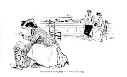 She thought it was perfectly grand, and she cleared all her photographs of boys away and began to make up her mind who the One would be, in hopes to be taken in. She probably never would have been, though, if it hadn't been for an accident. She and Ben and I were down in the town together with Mademoiselle, and Mademoiselle took us up to the photographer's to see about some pictures of hers. She has them done there and not by the New York man that comes once a year for the graduating class, because they're cheaper. Well, while we were waiting around Eleanor looked in a waste-basket to get a piece of paper to wipe some mud off her shoe, and there she found a photograph of a man. It was perfectly good enough except for a big blot of ink on the lowest right-hand corner, and that was prob'ly why it was thrown away. Eleanor thought she'd take it just for fun, and so she slipped it into a book she had and carried it home.