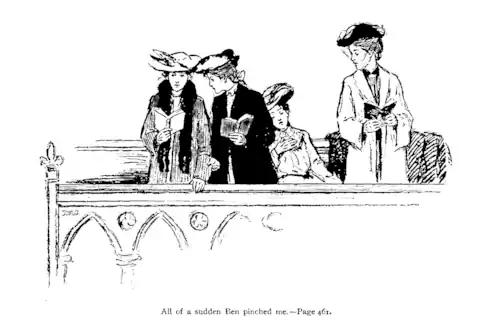 One Sunday which ne'er forgot will be, like Annie Laurie, Mademoiselle told Eleanor and Ben and me to come up into the front pew with her instead of way in the back with old Weeksey. Ben was mad, because right in front of our usual seat there is the funniest old lady that bows over and crosses herself just like a Catholic, and shouts out the hymns till we used to nearly die. And Ben didn't think we should be apt to find anyone so interesting up in the front. Little did we dream what we were to find, as the novels say.