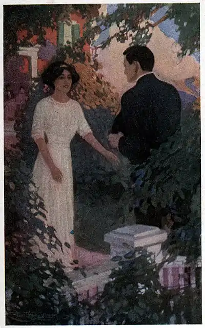 When he opened the gate that evening he saw that the wide veranda was well occupied. Four young men were making exceedingly light conversation to two young women. William Crooks was nowhere visible. Miss Crooks came down the walk to meet him, and held out two slim hands in welcome.