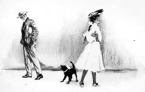 The next day his cup of bitterness was filled yet fuller. Harry cut him! He met her on the way across the campus at noon. She was immaculately tidy in a blue skirt and a fresh white shirt-waist and her red hair fell in a neat braid at her back. She carried a bundle of books under her arm and Snip, the fox terrier, ran beside her. Roy nodded with a friendly smile, but his only reward was an unseeing glance from the blue eyes. The color flamed into Roy's face and he hurried on with bent head. I think Harry regretted her action the next instant, for when he had passed she turned and looked after him with a little wistful frown on her face.