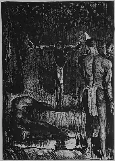 "Probably they took him for a lunatic; at any rate, they soon began to laugh at him, shaking and talking in their midst. He was a new thing to have sport with, and N'Komo presently leaned forward, grinning, touched him on the arm, and pointed. The white man's eyes followed the black finger to where a poor devil lay on the ground, impaled by a stake through his stomach. It was N'Komo's way of telling him what to expect, and he understood. He stopped talking.