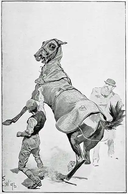 Mr. "Warren Telfer was a gentleman of means, and the owner of a few—very few—racehorses. But he had a great knack of buying hidden prizes in yearlings, and what his stable lacked in quantity it often more than made up for in quality. Thus he had once bought a St. Leger winner for as little as a hundred and fifty pounds. Many will remember his bitter disappointment of ten or a dozen years back, when his horse, Matfelon, starting an odds-on favourite for the Two Thousand, never even got among the crowd, and ambled in streets behind everything. It was freely rumoured (and no doubt with cause) that Matfelon had been "got at" and in some way "nobbled." There were hints of a certain bucket of water administered just before the race—a bucket of water observed in the hands, some said of one, some said of another person connected with Ritter's training establishment. There was no suspicion of pulling, for plainly the jockey was doing his best with the animal all the way along, and never had a tight rein. So a nobbling it must have been, said the knowing ones, and Mr. Warren Teller said so too, with much bitterness. More, he immediately removed his horses from Ritter's stables, and started a small training place of his own for his own horses merely; putting an old steeplechase jockey in charge, who had come out of a bad accident permanently lame, and had fallen on evil days.