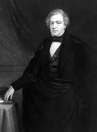 FILLMORE, Millard, American statesman, 13th President of the United States: b. Summer Hill, Cayuga County, N. Y., 7 Feb. 1800; d. Buffalo, 8 March 1874. He was descended from New England parentage and reared to the hard life of a frontier farm in western New York. He studied law at Buffalo and began the practice of his profession in 1827 in the neighboring town of Aurora. In 1830 he moved to Buffalo and formed, with Nathan K. Hall and Solomon G. Haven, a law partnership which soon became well-known throughout the region. But he had already served two years in the New York legislature and identified himself with the repeal of the harsh law of the State for the imprisonment of debtors. In 1832 he was sent to the national House of Representatives as a follower of Henry Clay. During the next decade he alternated between membership in the House and the work of his profession, building all the while a state-wide reputation as a political leader. As a result of the “landslide” of 1840 he found himself in Congress and chairman of the House committee of ways and means and as such he drew the tariff bill of 1842 which became a law and also set in motion the free trade influences of the lower South. He was thus a representative of the industrial and financial interests of the North against which the South and West made an alliance in the presidential campaign of 1844. He became a candidate for the governorship of New York upon the retirement of William H. Seward in 1844 and was defeated by Silas Wright, the democratic candidate. Three years later he was elected comptroller of the State of New York from which office he was chosen in 1848 to be a candidate for the vice-presidency with General Taylor. Taylor and Fillmore were elected. By this time a sharp difference of opinion between the Seward and the Fillmore men had developed. Seward, Wed and Greeley labored hard and long to gain the favor of the new President. They were successful. Fillmore naturally tended to a closer support of Clay, who manifested a hearty ill will toward Taylor. Fillmore was inaugurated vice-president in March 1849; Seward became a member of the Senate in December following. The division in the Whig party of New York was typical of the larger division in the party as a whole. When President Taylor took a vigorous stand against the threats of Southern leaders to secede in 1849-50, Seward and most of the Northern Whigs supported him and seemed ready to take the chance of civil war. But Fillmore drew still nearer to Clay and the southern Whigs, endeavoring to avoid conflict by compromise. Thus when Congress took up the problem of restricting slavery in the territories acquired from Mexico, the administration took one view while the great leaders of the party in Congress took another. Fillmore's position as president of the Senate was, therefore, very difficult. After several months of debate and an apparently complete deadlock, President Taylor suddenly died. Fillmore succeeded to the presidency on 9 July 1850. The Taylor cabinet promptly resigned. A new one was formed with Webster at its head. Clay was now in close touch with the administration, if he did not actually advise and direct its course. There was no longer a question of the peaceable solution of the pending issues. Clay, Webster, Fillmore and the Southern Whigs, aided by the Northern Democrats, arranged for the admission of California, the organization of New Mexico, the payment of the Texan claims, the prohibition of the slave trade in the District of Columbia and the return of fugitive slaves. Although Clay died two years later the popular hero of the compromise struggle, Webster and Fillmore lost standing in the North. When the next Whig convention met, Fillmore endeavored to secure the nomination for the presidency. Webster's friends pressed his claims, but Seward and the irate Northern Whigs would not permit either nomination. The foreign policy of the Fillmore administration was strong and vigorously American, although it was not expansionist like so many others of that period. Fillmore indicated to Europe very plainly that American ideals were still strongly democratic through Webster's famous Hulseman letter in which the government of Austria was told that the people of the United States always sympathized with democratic revolutions, especially with the Hungarian uprising against government imposed from without. There has never been a stronger presentation of the American attitude than that put forth by Fillmore and Webster in 1852. At the close of the administration Fillmore returned to Buffalo where he spent the remainder of his life except two or three prolonged visits to Europe. In 1856 the American or Know Nothing party nominated him for the presidency but he received only a small popular vote and the one electoral vote of a single State, Maryland. He and his supporters in the North, men like Edward Everett and Robert Winthrop, were known as the Silver Grey or Cotton Whigs. But when President-elect Lincoln passed through Buffalo on his way to Washington in 1861 Fillmore was chosen to greet him on behalf of the city. Nor was there ever any question of his loyalty to the cause of the Union. There is no good life of Fillmore, although a great many of his papers have been published in volumes X and XI of the Buffalo Historical Society publications. Consult also Rhodes, J. F., ‘History of the United States’ (Vol. I), and Bancroft, Frederic, ‘Life of William H. Seward’ (Vol. I).