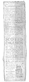 attempt to deceive the public into the belief that the emulsion will be helpful in all cases. Whether or not Scott's Emulsion is superior to other cod-liver oils is beside the present question. If all patent medicine "copy" were written in the same spirit of honesty as this, I should have been able to omit from this series all consideration of fraud, and devote my entire attention to the far less involved and difficult matter of poison. Unhappily, all of the Scott's Emulsion advertising is not up to this standard. Unhappily, all of the Scott's Emulsion advertising is not up to this standard. In another newspaper I have seen an excerpt in which the Scott & Browne Company come perilously near making, if they do not actually make, the claim that their emulsion is a cure, and furthermore make themselves ridiculous by challenging comparison with another emulsion, suggesting a chemical test and offering, if their nostrum comes out second best, to give to the institution making the experiment a supply of their oil free for a year. This is like the German druggist who invented a heart-cure and offered two cases to any one who could prove that it was injurious!