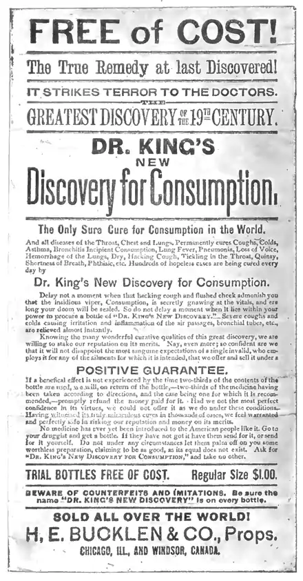 Certain members of the Proprietary Association of America (the patent medicine "combine") with whom I have talked have urged on me the claim that there are firms in the nostrum business that are above criticism, and have mentioned H. E. Bucklen & Co., of Chicago, who manufacturer a certain salve. The Bucklen salve did not particularly interest me. But when I came to take up the subject of consumption cures I ran unexpectedly on an interesting trail. In the country and small city newspapers there is now being advertised lavishly "Dr. King's New Discovery for Consumption." It is proclaimed to be the "only sure cure for consumption." Further announcement is made that "it strikes terror to the doctors." As it is a morphin and chloroform mixture, "Dr. King's New Discovery for Consumption" is well calculated to strike terror to the doctors or to any other class of profession, except, perhaps, the undertakers. It is a pretty diabolical concoction to give to anyone, and particularly to a consumptive. The chloroform temporarily allays the cough, thereby checking Nature's effort to throw off the dead matter from the lungs. The opium drugs the patient into a deceived cheerfulness. The combination is admirably designed to shorten the life of any consumptive who takes it steadily. Of course, there is nothing on the label of the bottle to warn the