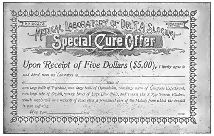 "which," says the certificate, "will, in a majority of cases, effect a permanent cure of the malady from which the invalid is now suffering." Whatever ails you - that's what Dr. T.A. Slocum cures. For $10 you get almost twice the amount, plus the guarantee. Surely there is little left on earth, unless Dr. Slocum should issue a $15 offer, to include funeral expenses and a tombstone.