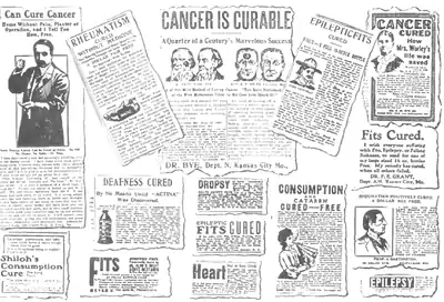 There are being exploited in this country to-day more than 100 cures for diseases that are absolutely beyond the reach of drugs. They are owned by men who know them to be swindles, and who in private conversation will almost always evade the direct statement that their nostrums will "cure" consumption, epilepsy, heart disease and ailments of that nature. Many of them "guarantee" their remedies. They will return your money if you aren't satisfied. And they can afford to. They take the lightest of risks. The real risk is all on the other side. It is their few pennies per bottle against your life. Were the facile patter by which they lure to the bargain a menace to the pocketbook alone, one might regard them only as ordinary followers of light finance, might imagine them filching their gain with the confidential, half-brazen, half-ashamed leer of the thimblerigger. But the matter goes further and deeper. Every man who trades in this market, whether he pockets the profits of the maker, the purveyor of the advertiser, takes toll of blood. He may not deceive himself here, for here the patent medicine is nakedest, most cold-hearted. Relentless greed sets the trap and death is partner in the enterprise.