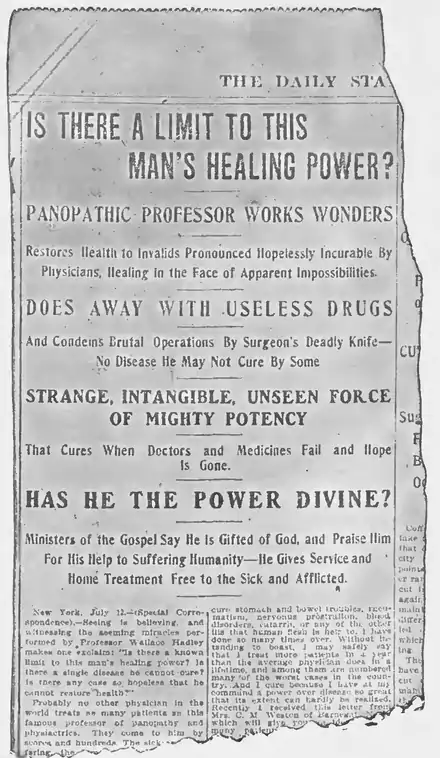 The New Orleans States sells its space to a species of quackery so blasphemous that the clergy of that city might well make it the subject of concerted protest. The advertiser is a "Panopathic Professor," Wallace Hadley of New York, who offers to cure all diseases at any distance, and thus exploits himself in huge type: