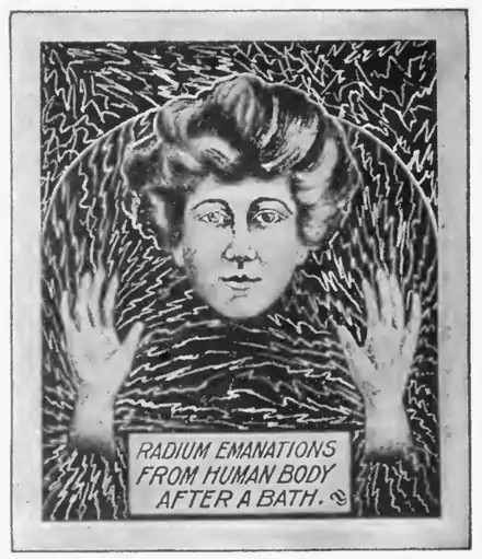 Their circular embodies a picture of a young female exhaling zigzag streaks from her head and hands in a manner to suggest that she has just been short-circuited, the illustration being labeled "Radium Emanations from Human Body after a Bath." The literature goes on to describe in modest and restrained terms the virtues of the spring.
