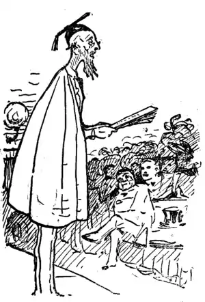 At top speed, hatless and gowned, clutching his notes, the tall and lanky Don careered, as might a camel career whom some massive lion pursues in the deserts of the East. Not often are the streets of London afforded so great a spectacle as that of a Philosopher, muddily splashed, gowned and hatless, with long loose legs and wild head in air, racing with a mob at his heels.