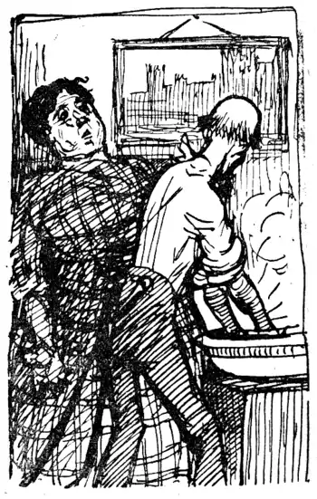 Mrs. Randle was partially recovered, but still woefully shaken. He got past her brutally enough, pushed into the ground floor room in the front of the house, and sat down. He felt the exhaustion of his walk and the irritation of the scene which had just passed to be too much for him. Mrs. Randle, with a large affection, stood at the table before him, leaning heavily upon it with her fists, and saying, "Oh, sir!" consecutively several times, until her emotion was sufficiently calm to permit of rational speech. Then she asked him where he had been.