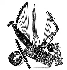 Stringed instruments. — The bow being one of the first implements of hunting and warfare, it may have been among the earliest of musical instruments. Certain it is that rude harps shaped like a bow occurred frequently among savages. The number of strings varies from one or two upward, though the weakness of the framework usually limits both number and tension. Experiments are frequent with rude lyres or zithers having strings stretched over a resonance-body, such as a flat piece of wood or a hollow box. These types pass over into rudimentary lutes, having both a resonance-box and a neck to extend the strings. Much ingenuity is shown in making the strings out of plant-fibers, hair other animal tissues, metal. Many examples are found of instruments sounded by the friction of a bowstring, prefiguring the great family of viols.