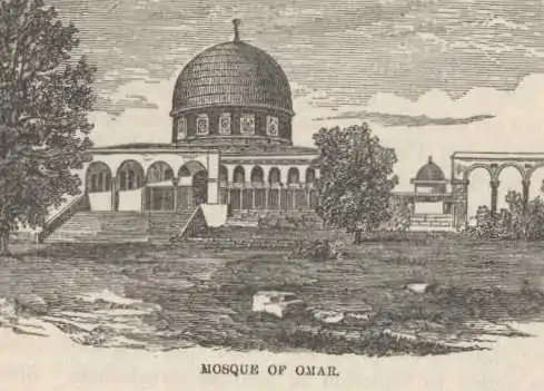 The mighty Mosque of Omar, and the paved court around it, occupy a fourth part of Jerusalem. They are upon Mount Moriah, where King Solomon’s Temple stood. This Mosque is the holiest place the Mohammedan knows, outside of Mecca. Up to within a year or two past, no Christian could gain admission to it or its court for love or money. But the prohibition has been removed, and we entered freely for bucksheesh.
