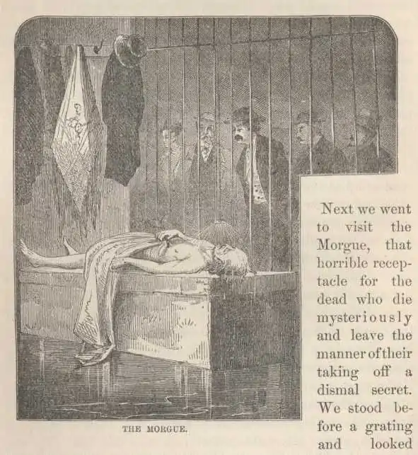 Next we went to visit the Morgue, that horrible receptacle for the dead who die mysteriously and leave the manner of their taking off a dismal secret. We stood before a grating and looked through into a room which was hung all about with the clothing of dead men; coarse blouses, water-soaked; the delicate garments of women and children; patrician vestments, hacked and stabbed and stained with red; a hat that was crushed and bloody.