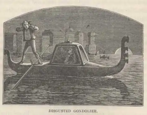We reached Venice at eight in the evening, and entered a hearse belonging to the Grand Hotel d’Europe. At any rate, it was more like a hearse than any thing else, though to speak by the card, it was a gondola. And this was the storied gondola of Venice!--the fairy boat in which the princely cavaliers of the olden time were wont to cleave the waters of the moonlit canals and look the eloquence of love into the soft eyes of patrician beauties, while the gay gondolier in silken doublet touched his guitar and sang as only gondoliers can sing! This the famed gondola and this the gorgeous gondolier!--the one an inky, rusty old canoe with a sable hearse-body clapped on to the middle of it, and the other a mangy, barefooted guttersnipe with a portion of his raiment on exhibition which should have been sacred from public scrutiny. Presently, as he turned a corner and shot his hearse into a dismal ditch between two long rows of towering, untenanted buildings, the gay gondolier began to sing, true to the traditions of his race. I stood it a little while. Then I said: