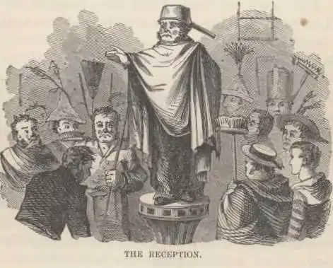 The third cook, crowned with a resplendent tin basin and wrapped royally in a table-cloth mottled with grease-spots and coffee stains, and bearing a sceptre that looked strangely like a belaying-pin, walked upon a dilapidated carpet and perched himself on the capstan, careless of the flying spray; his tarred and weather-beaten Chamberlains, Dukes and Lord High Admirals surrounded him, arrayed in all the pomp that spare tarpaulins and remnants of old sails could furnish. Then the visiting “watch below,” transformed into graceless ladies and uncouth pilgrims, by rude travesties upon waterfalls, hoopskirts, white kid gloves and swallow-tail coats, moved solemnly up the companion way, and bowing low, began a system of complicated and extraordinary smiling which few monarchs could look upon and live. Then the mock consul, a slush-plastered deck-sweep, drew out a soiled fragment of paper and proceeded to read, laboriously: