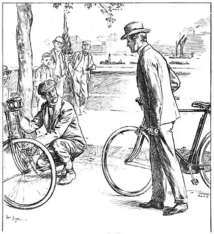 About nine o'clock Pringle started in search of his new acquaintance, but at the hotel he was met by a fresh difficulty—he knew no name by which to describe the stranger, and could only ask for "a gentleman with a bicycle."