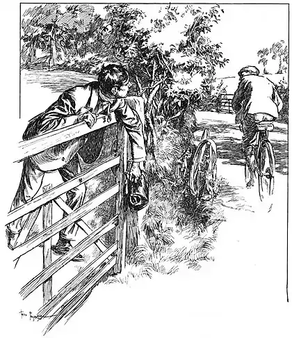 Pringle, with every sense alert, looked out. No one alighting? Yes, here he was. The guard had already evicted the two cycles when Thomas, with the precious valise, hurried down the platform and seized his own. The supreme moment had arrived. Pringle waited until the other had disappeared, and stepped on to the platform as the train began to move. There was no need for him to hurry; the damage he had inflicted on the crock would ensure its leisurely running. And true enough, when he reached the station door Thomas had got but a little way along the road in a bumpy fashion, which even to his inexperience might have told the rapid deflation of the tyres. His progress was further complicated by the presence of the bag, which he had no means of fastening, to the cycle; and, slowly as Pringle followed, the distance between them rapidly shortened, until when Thomas turned into the main road he was nearly up to him. Pringle halted a few seconds to allow a diplomatic gap to intervene, and then followed round the corner as Thomas shaped a painful course along the Colchester road. On and on, growing ever slower, the way led between high edges, until with a pair of absolutely flat tyres there dawned upon Thomas's intelligence a suspicion that all was not well with the machine and, dismounting, he leant it against the hedge.