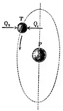 Suppose that from any cause the satellite (Fig. 2) so move about the planet that its centre describes a circle about the centre of in a plane passing through that point. So long as the conditions remain unaltered the motion continues the same. So soon however as any external disturbing force (shown here perpendicular to the plane of motion), begins to act upon one side of , alters its path. If this is to be prevented, another external force , equal and opposite to , must be brought simultaneously into action. If be a pound, must be also a pound; if increase to a ton, must increase to a ton also; the absolute value of does not further enter into the question, which is one solely of the equilibrium of the external disturbing forces acting upon . The existence of such an equilibrium in nature would presuppose the existence always of equally divided causes of force; it probably does not once occur in the case of celestial bodies. We are however at liberty to assume its possibility in order to simplify the matter.
