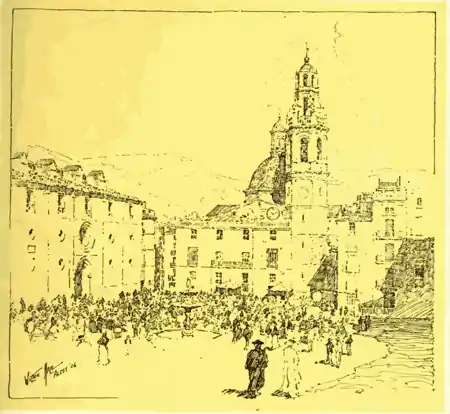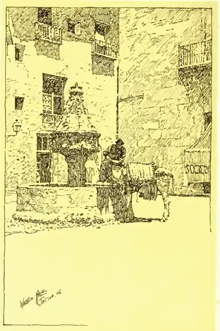 The gentleman chauffeur claimed our delay in leaving Jativa was due to the difficulty in making sketches, and, liking the cooking myself, I did not argue the point. More than that (almost), the village has an architectural beauty that is absent in many of the Spanish towns, and a charm that is shared by none. We care little for the fact that this had once been the home of the Borja, or Borgia, family. Of what moment was the imprisonment of Cæsar Borgia, in the castle high above the plaza, as compared to the nightly appearance in the plaza itself of a certain black-haired señora wearing the high comb of her country, a true Carmen in type and a rare one, who shopped loudly in the market-place and exchanged smiling indecencies with the men before the posada? That this was the birth-place of the great painter Ribera scarcely added to its attractiveness; but the photographs of his pictures hung bravely in the cathedral were a pathetic tribute of the poor little town to their revered citizen, and we swallowed down an appreciative knot in our throats.