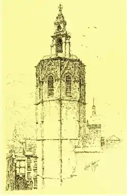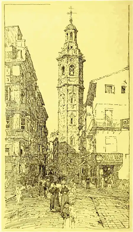 In Valencia the veiling was a strip of asphalt pavement. Perhaps, to a mechanic who has driven a beloved motor-car over 800 miles of tortuous Spanish road-bed, a strip of asphalt pavement will seem as good a reason for delay as one could offer. It was nicely situated in the heart of the town; one could dash from any point along the way into a perfect thicket of historical localities and still keep his eye on his car. This being the case, we saw more of the city than we would ordinarily have done. Moreover, one could buy fans, and postal cards even, in the very shadow of delightful ancient towers. Two of great beauty were octagonal in shape, and the design appealed particularly to our weak, many-sided dispositions. They were also extremely historical. On the site of one of these, the Miguelete, formerly stood a Moorish tower, and to the top of this the Cid once proudly led his wife, that she might view the lovely country he had wrested from the industrious Moriscos—and realize whom she had married.