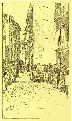 Our most valiant defendant, however, was Vicente. Tears of rage were in his soft eyes as he fought back his companions with his fierce little fists. To be sure, he did not use them well. The mild fighting of the Spaniard consists in violently pushing his opponent around in a circle—a bit of Islamism which the Moor left behind. But Vicente did his best. For two days he was my brave knight. Too shy to speak, but his hand proudly in mine, he led me through the winding ways of the ancient town. Then I committed the unpardonable sin; with his patched smock and shabby sabots so much in evidence, and grateful for his protection, I offered a piece of silver to the little boy of nine. Vicente looked at the silver and at me. His soft eyes flashed. Then, turning quickly, he flew up a twisted street. Staggered by the strangeness of these people, I ran weakly in pursuit, but I never saw him afterwards.