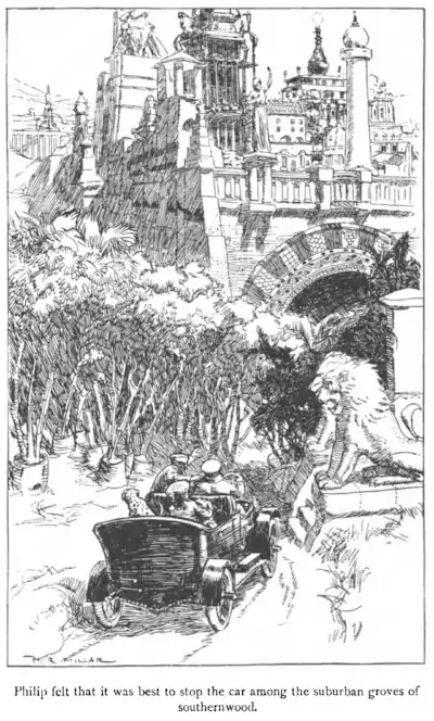 And so, at last, they came close to Polistopolis. Philip never could tell how it was that he stopped the car outside the city. It must have been some quite unaccountable instinct, because naturally, you know, when you are not used to being driven in motors, you like to dash up to the house you are going to, and enjoy your friends' enjoyment of the grand way in which you have travelled. But Philip felt—in that quite certain and quite unexplainable way in which you do feel things sometimes—that it was best to stop the car among the suburban groves of southernwood, and to creep into the town in the disguise afforded by motor coats, motor veils and motor goggles. (For of course all these had come with the motor car when it was wished for, because no motor car is complete without them.)