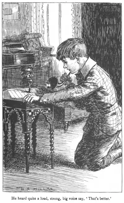 'There's an ear-trumpet in a box on the middle of the cabinet,' he could just hear the teeny tiny voice say; 'it belonged to a great-aunt. Get it out and listen through it.'