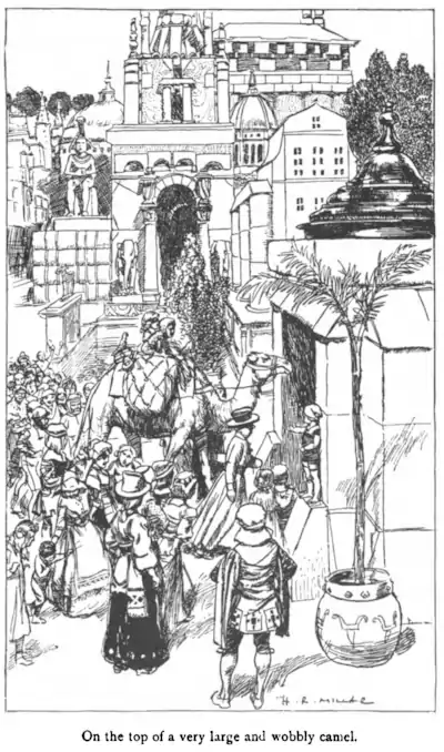 So now you see Philip, and Lucy who still wore her fairy dress, packed with all their belongings on the top of a very large and wobbly camel, and being led out of the city by the usual procession, with seven bands of music all playing 'See the Conquering Hero goes,' quite a different tune from the one you know, which has a name a little like that.