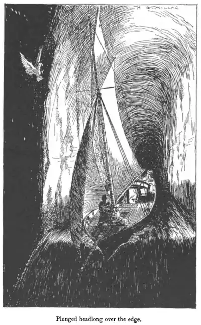 He listened. And he heard a dull echoing roar that got louder and louder. And he looked. The light of the lamps shone ahead on the dark gleaming water, and then quite suddenly it did not shine on the water because there was no longer any water for it to shine on. Only great empty black darkness. A great hole, ahead, into which the stream poured itself. And now they were at the edge of the gulf. The Lightning Loose gave a shudder and a bound and hung for what seemed a long moment on the edge of the precipice down which the underground river was pouring itself in a smooth sleek stream, rather like poured treacle, over what felt like the edge of everything solid.
