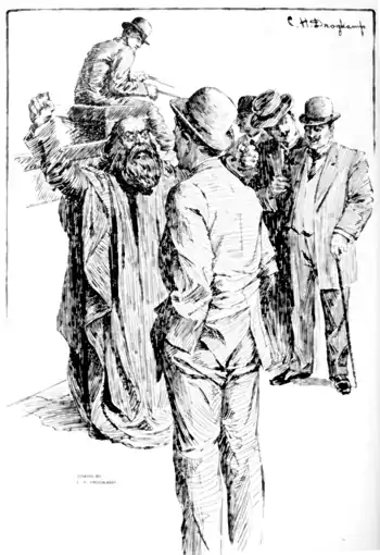 "Down by the court house are about a thousand people getting personal injury damages from the city and street cars. He goes into the street and hollers but they think he's advertising a dental parlor and no one stops. He hollers louder and waves his arms, and some thinks he's advertising a new Garden and some Germans stop. Then he cusses them and calls them beasts and swine so that at last everybody knows he's a modern prophet and that's the modern introduction to salvation and they all stops. Then he tells them how he is Manasha the Resusticator, returned but arriving for the first time to resusticate the living yet dead and dead where life was and a lot more so that no one can understand it and they all take it in.