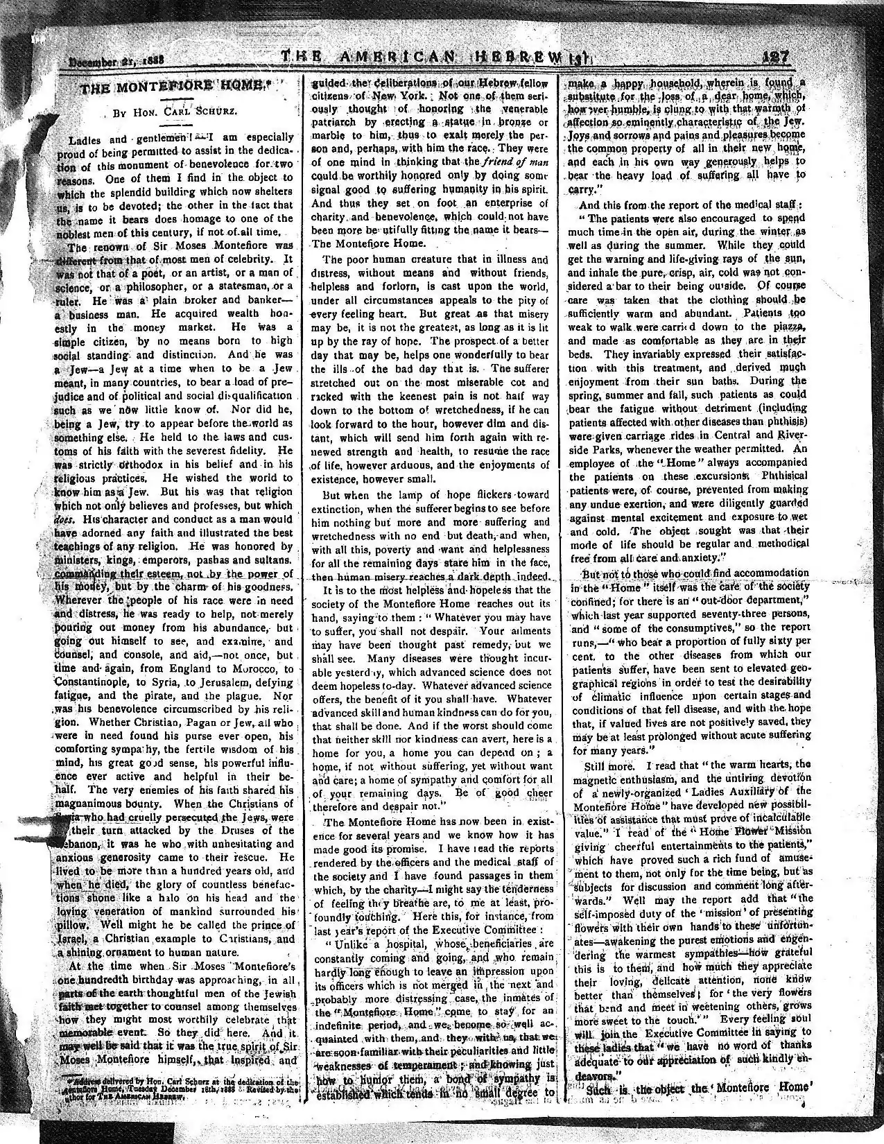 - ↑ Address delivered by Hon. Carl Schurz at the dedication of the Montefiore Home, Tuesday December 18th, 1888. Revised by the author for The American Hebrew.
