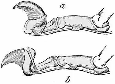| a. Toe at rest (claw sheathed); b, toe in action (claw thrown forward). The illustration shows the elastic ligament which passes from above the root of the claw downward and backward to the distal part of the second phalanx; also the long flexor tendon (which by being pulled backward draws down the claw) passing through the ligamentous loop attached to the under surface of the middle phalanx. The sesamoid bone beneath the distal end of the metacarpal is also shown. (After Mivart.) |