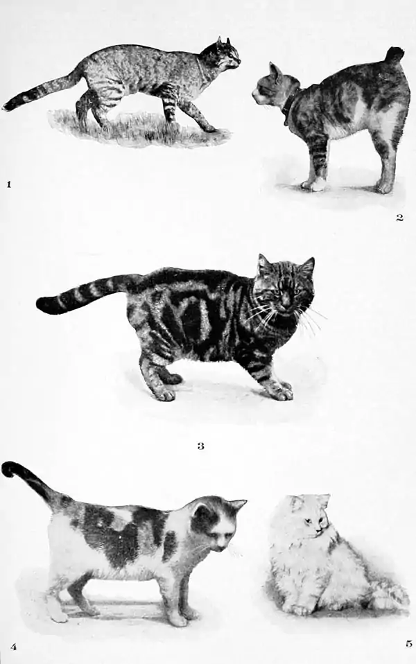 The Domestic Cat.—A cat, or cats, formed a part of the domestic circle in various parts of the world before the beginning of human record, and the question of the origin of the varied domestic races known within historic times may only be guessed at. Naturalists have attempted by a study of semi-fossil remains, mummies from ancient Egyptian tombs, a comparison of modern examples with wild forms of similar size, and a study of the reversionary tendencies exhibited by house-cats that return to a feral life, to determine the origin of the race, but have learned nothing definite. The best opinion seems to be that stated by J. E. Harting, F.L.S.: “Several wild species of Egyptian and Indian origin having been ages ago reclaimed, the inter-breeding of their offspring and crossing with other wild species in the countries to which they have been at various times exported has resulted in the gradual production of the many varieties, so different in shape and color, with which we are now familiar.”
