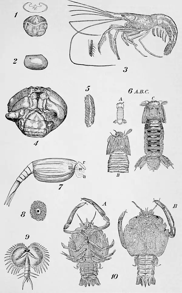 | 1. Dromiopsis, a round crab from the Upper Cretaceous of Denmark. 2. Leperditia, an ostracod; Silurian; Island of Gotland. 3. Æger, a prawn; Jurassic lithographic limestones; Bavaria. 4. Xanthopsis, a cyclometopan crab; Eocene; Bavaria. 5. Tarrilepas, a primitive cirriped, allied to the goose-barnacle; Silurian; Dudley, England. 6. Sculda pennata, a stomatopod; Upper Jura of Bavaria; A, outline of the fossil; B, dorsal view of head; C, ventral view of entire body, showing thoracic and abdominal appendages. 7. Ceratiocaris, a phyllocarid; Ordovician; Lanarkshire, England; showing the bivalve shell, some of the head appendages, and the segmented long abdomen with terminal spines. 8. Palæocrensia, a barnacle, allied to the acorn-shell, imbedded in a fossil coral of Lower Devonian age; New York State. 9. Pephricaris, a phyllocarid with spinose carapace; Chemung; New York State. 10. Eryon, a macruran; lithographic limestones of Bavaria; A, ventral aspect; B, dorsal aspect. |