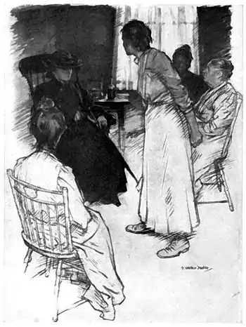 After the first cold greeting accorded Frances, no word was spoken. The four women among whom she sat rocked slowly back and forth, gazing fixedly at the stove, an expression of deprecatory meekness on their faces. One would almost have said that they purred. Their lids were drooped, but in their eyes was that peculiar glisten seen in those of a panther on guard.