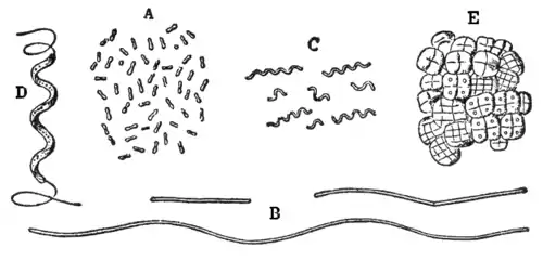 Bacte′ria, an immense group of extremely small plants which have attracted great attention on account of their relation to man and his interests. They are the smallest known of living organisms, whose adult bodies are sometimes barely visible under the highest powers of the microscope. They multiply by division with wonderful rapidity, and occur in the air, in the water, in the soil, in the bodies of plants and animals. Some of them are harmless, some are useful, and some are exceedingly dangerous. They are the agents of the processes known as fermentation and decay, inducing fruit juices, milk, etc. to sour, and also pus to form in connection with wounds and decay. What is called antiseptic surgery is the use of various means to exclude bacteria and so prevent inflammation and decay. As producers of disease, bacteria are known by various names, such as bacilli, microbes, germs, etc. They are the causes of contagious diseases, such as pear-blight and melon-wilt among plants, and such human diseases as tuberculosis, cholera, diphtheria, typhoid fever, etc. From the fact that bacteria are mostly ciliated and have powers of locomotion, they are associated in the popular mind with animals.