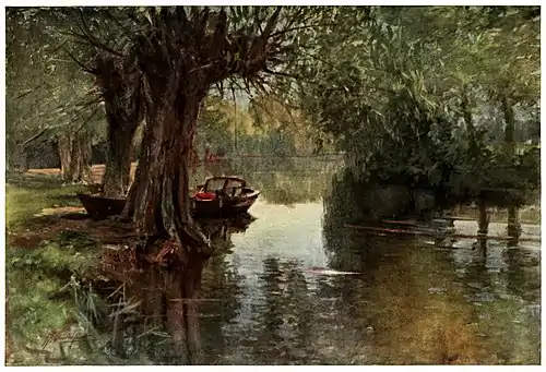 After that it was plain sailing—or punting. The picture of that London cad sprawling in the water, which my approval had created in his mind, had done it. And it was early and late too (there were few visitors that month) down by the Weir below the lock as far as Cliveden; up the backwater to the Mill—William stretched beside me while I worked, or pulling back and forth when a cool bottle—beer, of course, or a kettle and an alcohol lamp would add to my comfort.