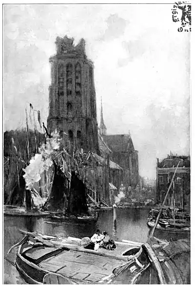 There is no delight so keen to an artist as returning to a place he has once painted and loved. I have known Dort and the little 'drecht across the way for some fifteen years, five of which have slipped by since I last opened my umbrella along its quaint quays. To my great joy nothing has changed. The old potato boat still lies close to the quay, under the overhanging elms. The same dear old man and his equally dear old wife still make their home beneath its hipped roof. I know, for it is here I lunch, the cargo forming the chief dish, followed by a saucer of stewed currants, a cup of coffee—(more hymns here)—and a loaf of bread from the baker's. The old Groote Kirk still towers aloft—the highest building in Holland, they say; the lazy, red-sailed luggers drift up and down, their decks gay with potted plants; swiss curtains at the cabin windows, the wife holding the tiller while the man trims sail. The boys still clatter over the polished cobbles—an aggressive mob when school lets out—and a larger crop, I think, than in the years gone by, and with more noise—my umbrella being the target. Often a spoilt fish or half a last week's cabbage comes my way, whereupon Bob awakes to instant action with a consequent scattering, the bravest and most agile making faces from behind wharf spiles and corners. Peter used to build a fence of oars around me to keep them off, but Bob takes it out in swearing.
