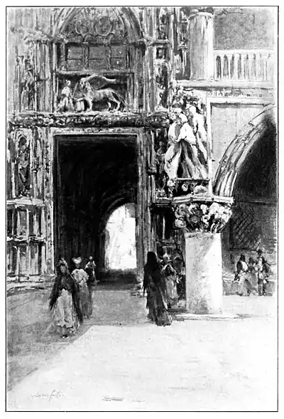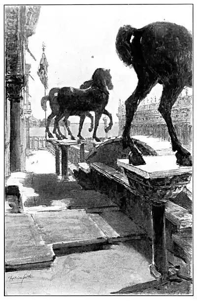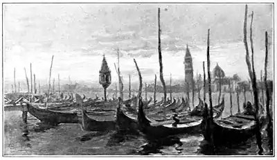 As for Luigi and me—we keep on our accustomed way, leading our accustomed lives. Seventeen years now since he bent to his oar behind my cushions—twenty-six in all since I began to idle about her canals. It is either the little canal next the Public Garden, or up the Giudecca, or under the bronze horses of San Marco; or it may be we are camped out in the Piazzetta before the Porta della Carta; or perhaps up the narrow canal of San Rocco, or in the Fruit Market near the Rialto while the boats unload their cargoes.