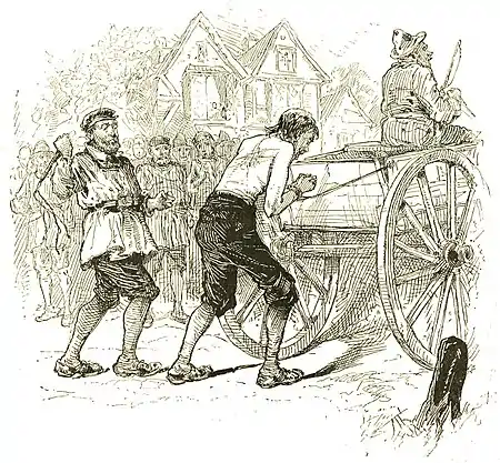 "Some—yes. Particularly new comers—such as small husbandmen turned shiftless and hungry upon the world because their farms were taken from them to be changed to sheep ranges. They begged, and were whipped at the cart's tail, naked from the girdle up, till the blood ran; then set in the stocks to be pelted; they begged again, were whipped again, and deprived of an ear; they begged a third time—poor devils, what else could they do?—and were branded on the cheek with a red hot iron, then sold for slaves; they ran away, were hunted down, and hanged. 'Tis a brief tale, and quickly told. Others of us have fared less hardly. Stand forth, Yokel, Burns, and Hodge—show your adornments!"